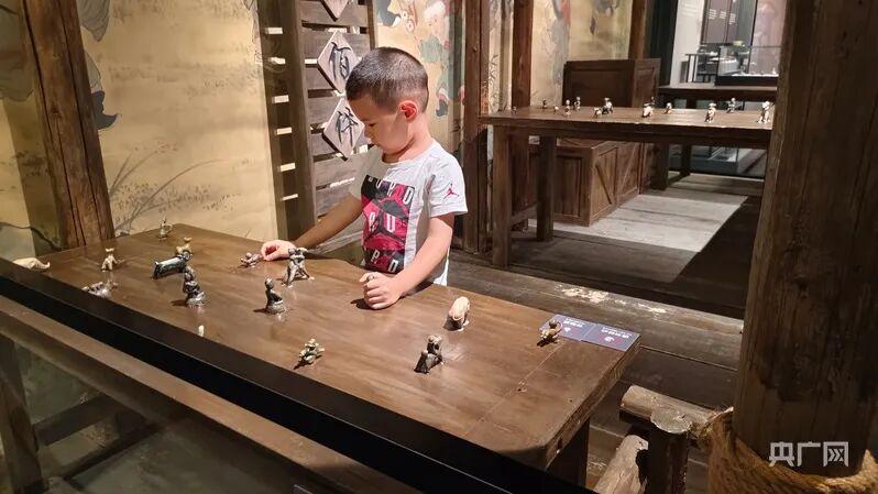 小朋友正在抚摸1:1复刻还原的邛窑出土文物(央广网见习记者 唐诗敏 摄)