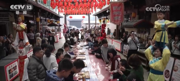这个春节,在福建省三明市沙县区俞邦村,可以看到沙县传统戏种——肩膀戏。小孩子站在大人肩膀上表演,孩子负责唱腔、头部表情和双手动作,大人负责台位变换的腿部动作,演绎经典名作中的选段。市集上,肩膀戏和鱼灯伴着铿锵锣鼓穿行街巷。肩膀戏热情洋溢,鱼灯摇曳、首尾相随,寓意年年有余、吉祥纳福。尝尝沙县小吃,体验地方年俗,恰似一张喜庆祥和的新春画卷。
