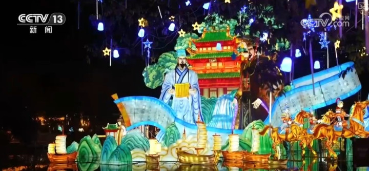 在甘肃,敦煌新春文化市集上,1200余件承载着丝路文化特色的花灯,点亮了新春的夜空。造型取材于反弹琵琶、三兔共耳等敦煌壁画经典意象融入灯组设计。大家身着汉服,赏花灯、踢毽子,感受博大精深的中华传统文化。